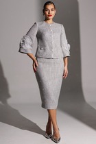 Комплект женский, 2-х предметный, из текстильной ткани, состоит из жакета и юбки. Жакет женский удлиненный, на подкладке, полуприлегающего силуэта с центральной бортовой застежкой на пуговицы до линии перегиба лацкана. Спереди рельефные швы от плечевого шва, отрезной бочок и карман с клапаном. Спинка с рельефами от плечевого шва. Рукав втачной, двухшовный, по низу рукава обработана шлица на петли-пуговицы. Воротник пиджачного типа. Длина по спинке 66 см, длина рукава 62 см. Юбка прямого силуэта, с фигурной кокеткой по переду и разрезом-шлицей. Заднее полотнище со средним швом, в котором обработана застежка потайная. Верх юбки обработан обтачками. Длина по боковому шву 64 см. Юбка на подкладке.