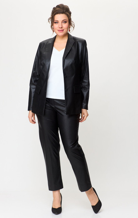 Это не просто две вещи — это готовый идеальный образ. Комплект из удлиненного жакета и классических брюк из эко-кожи создан для тех, кто ценит безупречный крой, актуальные тренды и выразительную лаконичность. Жакет полуприлегающего силуэта с центральной бортовой застежкой на пуговицы до линии перегиба лацкана. Спереди рельефные швы от плечевого шва,отрезной бочок и карман с клапаном. Спинка с рельефами от плечевого шва. Рукав втачной, двухшовный. Воротник пиджачного типа. Жакет полностью на подкладке. Брюки прямые, слегка заужены к низу,заутюжены стрелки,по переду обработаны карманы с отрезным бочком,застежка на тесьму-молнию и 1 пуговицу.На задних половинках обработаны вытачки и имитация карманов с листочкой, пояс в брюках притачной. Длина жакета по спинке 67 см, длина рукава 62 см, длина брюк по боковому 94 см.