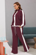 Комплект 2-х предметный из хлопковой ткани, состоит из жакета и и брюк. Жакет женский удлиненный, полуприлегающего силуэта с центральной бортовой застежкой на пуговицы до линии перегиба лацкана. Спереди рельефные швы от плечевого шва, отрезной бочок и карман с клапаном. Спинка с рельефами от плечевого шва. Рукав втачной, двухшовный, 3/4, с небольшим разрезом в локтевом шве. Воротник пиджачного типа. Перед жакета на подкладке. Длина рукава 50, длина по спинке 68 см. Классические брюки, прямые, слегка заужены к низу,заутюжены стрелки,по переду обработаны карманы с отрезным бочком,застежка на тесьму-молнию и 1 пуговицу.На задних половинках обработаны вытачки и имитация карманов в рамку с двумя обтачками,пояс в брюках притачной. По низу брюк в боковом шве есть небольшой разрез. Длина брюк от талии по боковому шву 93 см.