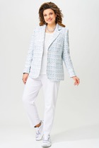 Комплект женский-двойка, из текстильной ткани, жакет удлиненный, полуприлегающего силуэта с центральной бортовой застежкой на пуговицы до линии перегиба лацкана. Спереди рельефные швы от плечевого шва, отрезной бочок и карман с клапаном. Спинка с рельефами от плечевого шва. Рукав втачной, двухшовный. Воротник пиджачного типа. Жакет на подкладке, длина по спинке 67 см, длина рукава 62 см. Брюки прямые, классические, с заутюженными стрелками, по переду обработаны карманы с отрезным бочком, застежка на тесьму-молнию и 1 пуговицу. На задних половинках обработаны вытачки и имитация карманов с листочкой, пояс в брюках притачной, сбоку на резинке. Длина брюк от талии по боковому шву 103 см.