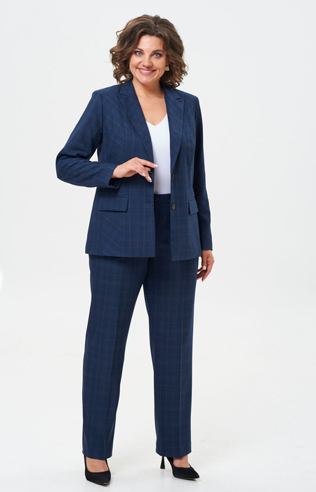 Комплект женский-двойка, из текстильной ткани, жакет удлиненный, полуприлегающего силуэта с центральной бортовой застежкой на пуговицы до линии перегиба лацкана. Спереди рельефные швы от плечевого шва, отрезной бочок и карман с клапаном. Спинка с рельефами от плечевого шва. Рукав втачной, двухшовный. Воротник пиджачного типа. Жакет на подкладке, длина по спинке 67 см, длина рукава 62 см. Брюки прямые, классические, с заутюженными стрелками, по переду обработаны карманы с отрезным бочком, застежка на тесьму-молнию и 1 пуговицу. На задних половинках обработаны вытачки и имитация карманов с листочкой, пояс в брюках притачной, сбоку на резинке. Длина брюк от талии по боковому шву 103 см.