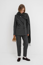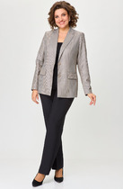 Комплект женский-двойка,из костюмной ткани, жакет удлиненный, свободного силуэта с центральной бортовой застежкой на пуговицы до линии перегиба лацкана. По переду имеется отрезной бочок и вертикальные вытачки. С прорезными карманами с клапаном и двумя обтачками. Спинка цельная. Воротник пиджачного типа. Рукав двухшовный, втачной. Жакет на подкладке. Длина рукава 63 см, длина по спинке 75 см. Брюки-палаццо,средней ширины, выполнены с карманами с отрезным бочком в боковом шве. Пояс притачной, застёжка на молнию. По задним половинкам обработаны вытачки. Длина по боковому шву 108 см.