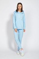 Костюм женский трех предметный. Брюки на поясе с отделочными полосками по бокам. Блузка удлиненная с закругленными разрезами по бокам. Рукав 3\4 с манжетой патай. Воротник рубашечный на стойке. Жилет с подрезами по переду и декоративной отделкой.