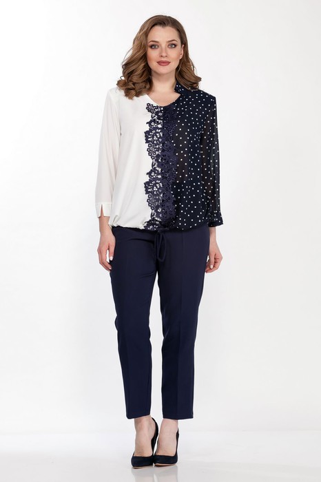 Комплект женский двухпредметный состоит из блузки и брюк. Блузка нарядная выполнена из  блузочной ткани контрастных цветов свободного силуэта. Вырез горловины V-образный с воротником на стойке, рукав 3/4 с притачным манжетом, низ на кулиске затягивается на шнурок. Полочка по центру украшена кружевом. Длина блузки по спинке 70 см, длина рукава 52 см. Брюки  классические  с высокой посадкой, полуприлегающего силуэта, выполнены из плотной костюмной ткани с добавлением эластана.  Пояс без резинки, с застежкой молнией на пуговицу. В боковых швах карманы с листочкой. Длина брюк 103 см.