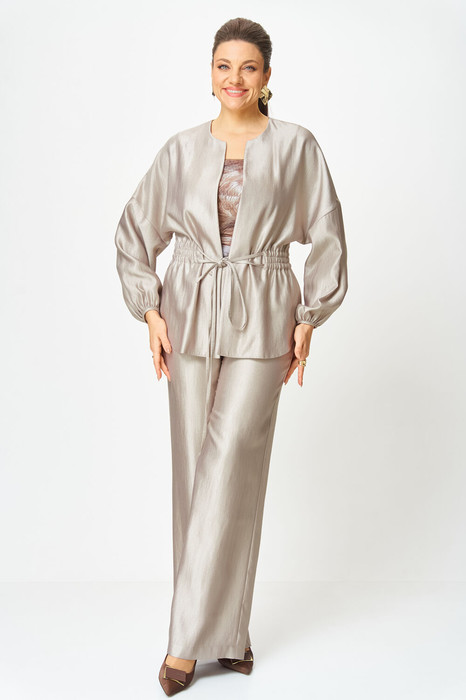 Стильный женский костюм выполнен из ткани с небольшим блеском.