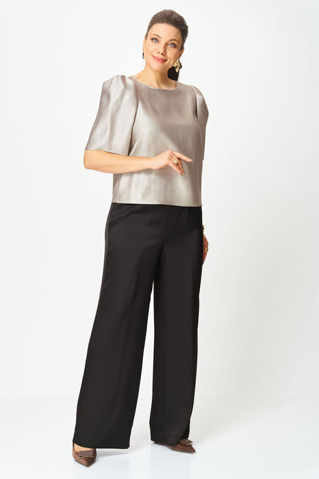 Блузка свободного силуэта из плательной ткани с блеском. Горловина круглая, по спинке в центральном шве разрез возле горловины с завязками.