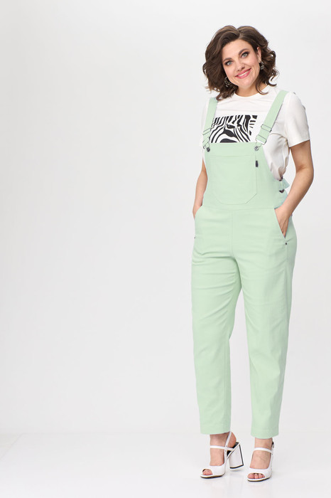 Комбинезон выполнен в спортивном стиле, отрезной по линии талии, с бретелями застегивающими на металлическую застежку. По переду на груди накладной карман. По брюкам в боковых швах лампасы, по переду в боковых швах брюк на уровне бедер карманы. На задних половинках накладные карманы.