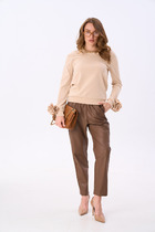 Брюки заужены к низу, по боковым швам на уровне бедер наклонные карманы с подрезным бочком, пояс на резинке. По низу брюк отложной манжет.
