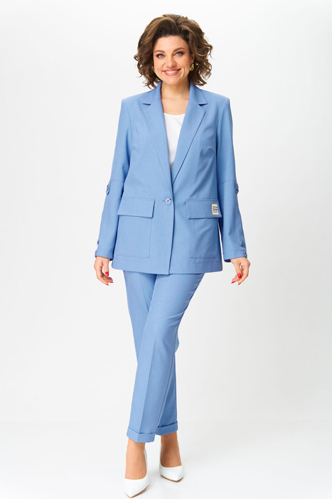 Жакет полуприлегающего силуэта, с центральной застежкой на одну пуговицу, борт с отворотом лацкана и воротником пиджачного типа. По переду накладные карманы с клапаном, рукава втачные с подрезом по линии локтя и патой для подхвата рукава на пуговицы. Жакет без подкладки. Все отделочные строчки на костюме выполнены контрастными нитками.