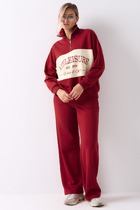 Брюки из однотонного трикотажа, по боковым швам лампасы с отделочным кантом, на уровне бедер карманы в боковых швах, верх брюк на поясе с резинкой.