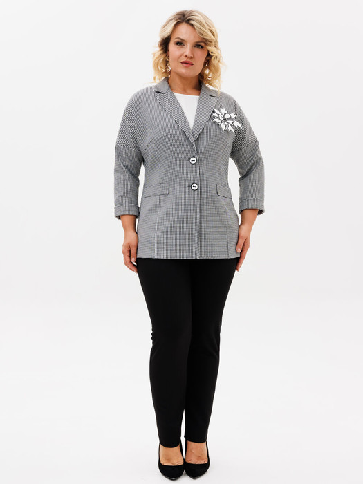 Стильный костюм, из поливискозной ткани, в мелкую гусиную лапку .Жакет свободного силуэта, длиной ниже линии бедер, со спушенной линией плеча. Детали переда с отрезными боковыми деталями, воротником жакетного-типа. На боковых частях переда расположены боковые карманы. В комплект входит пояс из основной ткани, подчеркивая силуэт, делает его более приталенным . Спинка с боковыми отрезными деталями. Рукава длинной 7/8. Классические . Жакет на подкладке. В комплект входит дизайнерский-декоративный цветок, при желании его можно снять. Брюки классические прямого силуэта, пояс  на резинке, застёжка на молнию. Можно надеть в сочетание с блузкой, топом. Классика изначально обречена на успех.