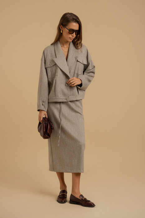 Комплект женский двухпредметный из смесовой ткани. Жакет свободного покроя. Вырез горловины - пиджачного типа фантазийной формы. Застежка - однобортная на петли с пуговицами. Рукава - втачные со спущенной линией плеча. Внизу рукавов - имитация шлиц с пуговицами. Спереди выполнены накладные карманы со складкой и клапаном. По низу изделия - отрезной пояс с мягкими складками для объема. Изделие посажено на подкладку. Юбка - зауженная к низу со шлицой на спинке. Пояс- отрезной с эластичной тесьмой и застежкой на петлю с пуговицей. в боковых швах имеются карманы с отрезными бочками. Юбка декорирована поясом в виде шнурка из основной ткани. Изделие посажено на подкладку.