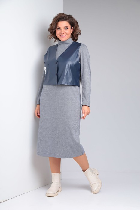 Комплект женский состоит из платья и жилета. Платье полуприлегающего силуэта длиной миди. Перед с нагрудными вытачками. Спинка с талиевыми вытачками и средним швом, сверху которого обработанная застежка на потайную молнию , а снизу шлица. Рукав втачной одношовный. Воротник - стойка. Жилет из экокожи с центральной застежкой на кнопки. Перед с нагрудным накладным карманом с нашивкой. Спинка со средним швом. Горловина V-образной формы. Жилет на подкладке, притачной  по низу.