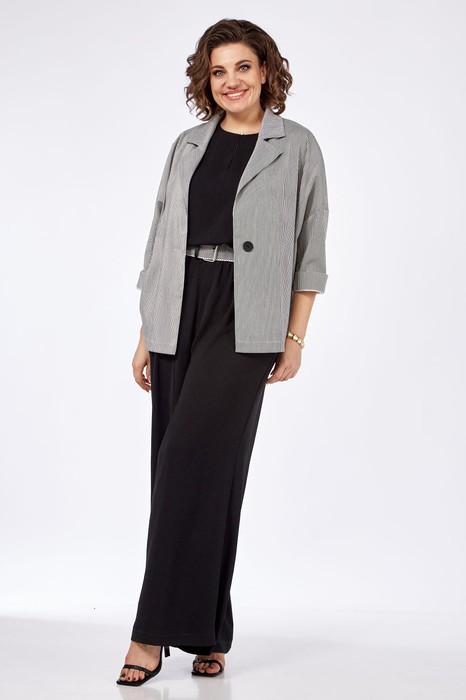 Комплект женский состоит из комбинезона и жакета. Комбинезон свободного кроя с застежкой на поясную петлю и пуговицу и на спинке, и спереди. Верхняя часть с нагрудными вытачками. Нижняя часть с боковыми карманами в швах. В области талии резинка. Жакет свободного кроя с застежкой на петлю и пуговицу. Рукав одношовный со спущенной линией плеча. Воротник пиджачного типа.Пояс в комплекте.