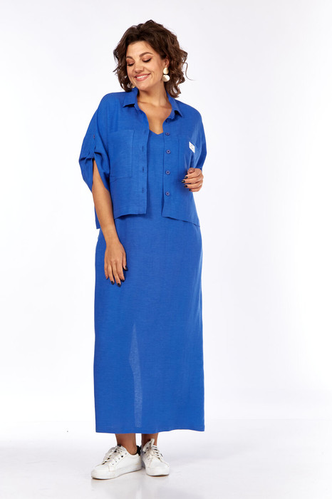 Комплект женский состоит из блузона и сарафана. Сарафан полуприлегающего силуэта, на бретелях, со средним швом по спинке, который заканчивается разрезом. По переду нагрудные вытачки, в боковых швах обработаны карманы. Блузон свободного кроя со спущенной линией плеча. Втачной одношовный рукав с регулируемой длиной с помощью хлястика. По переду накладные карманы. По спинке кокетка. Воротник стояче-отложной с отрезной стойкой.
