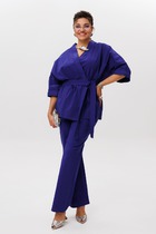 Комплект брючный состоит из блузы и брюк. Блуза полуприлегающего силуэта с центральной застежкой на петли и пуговицы. Линия плеча спущенная, воротник стояче-отложной с отрезной стойкой. По переду и спинке на линии талии -кулиса со шнуром. По боковым швам разрезы. Брюки прямые, верхний срез обработан поясом с резинкой. В бококвых швах карманы. В качсетве отделки используется шнур.