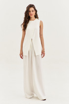 Комплект брючный состоит из блузы и брюк. Брюки прямые, широкие, с боковыми карманами и поясом частично на резинке. Блузон свободного кроя с цельнокройным рукавом. Перед с ассиметричными подрезами и вертикальной кулисой со шнуром, который создает драпировку с левой стороны. Детали переда выполнены в разных цветах. Горловина V-образной формы, обработана обтачкой.