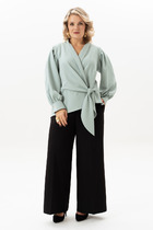 Комплект брючный состоит из кофты и брюк. Кофта свободного кроя с рукавом реглан. По низу рукава и низу изделия отделочный манжет-довяз, горловина круглая с отделочной бейкой (довяз). В качестве отделки используется вышивка. Брюки прямые, верхний срез обработан поясом с резинкой. В боковых швах обработаны карманы. На передних половинках застрочены складки.