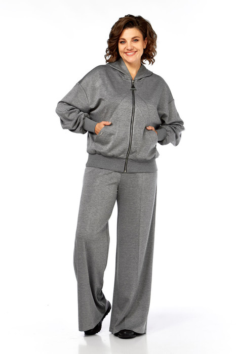 Комплект брючный кофта+брюки. Кофта свободного кроя с центральной застежкой на тесьму-молнию. Спущенная линия плеча, рукав втачной, 2-шовный с пританчым манжетом по низу (довяз). На локтевой части складки. По спинке средний шов. По переду рельефные швы-в швах обработаны карманы. По низу отделочный манжет (довяз). Капюшон со средней частью. Брюки широкие. Верхний срез обработан поясом с резинкой по спинке.В боковых швах обработаны карманы. В качестве отделки используется отделочная строчка и фурнитура.
