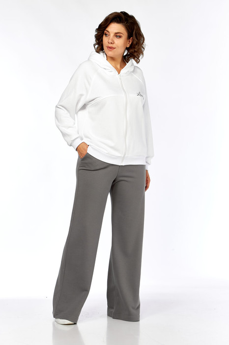 Комплект брючный.Кофта свободного кроя с центральной застежкой на тесьму-молнию. Рукав покроя реглан с притачным манжетом по низу (довяз). По переду и спинке кокетки. Капюшон со средним швом. По низу изделия отделочный пояс (довяз). В качестве отделки используется вышивка. Брюки широкие, верхний срез обработан поясом с резинкой. В боковых швах обработаны карманы.