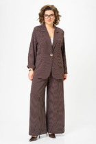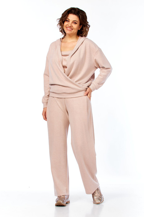 Комплект брючный состоит из кофты, топа и брюк. Кофта свободного кроя со спущенной линией плеча, на запах. Рукав втачной одношовный с манжетом по низу. Капюшон цельнокройный с передом по низу изделия, притачной пояс. Топ полуприлегающего силуэта на бретелях. по переду нагрудные вытачки. Бретели регулируются по длине. Брюки расширенные к низу, карманы в боковом шве, по переду линии притачивания, заложены складки. Верхний срез обработан поясом с резинкой.
