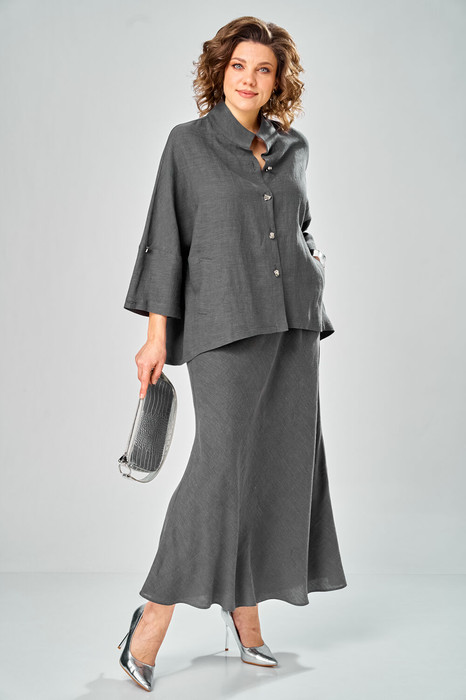Комплект женский состоит из юбки и рубашки. Рубашка свободного кроя с центральной застежкой на петли-пуговицы. Спущенное плечо, втачной одношовный рукав (фиксируется отворот на петлю и пуговицу) по переду прорезные карманы с листочкой. Воротник-стойка. Юбка длинная, верхний срез обработан поясом на резинке с застежкой на петлю и пуговицу в левом боковом шве с потайной тесьмой-молнией. Юбка кроенная по косой. На заднем полотнище талиевые вытачки.