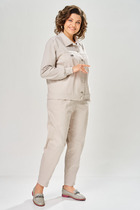 Комплект брючный состоит из жакета и брюк. Жакет полуприлегающего силуэта с центральной застежкой на петли и пуговицы. По переду кокетка, рельефные швы до низа, отрезной пояс по низу. Рукав втачной , одношовный полной длины с манжетом. Воротник стояче-отложной. Брюки зауженные к низу, застрочены вытачки, на передних половинках на уровне колена застрочены вытачки, в боковых швах обработаны карманы с листочкой, на задней половинке накладные карманы.Пояс с резинкой и шнурком.