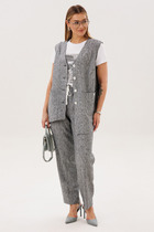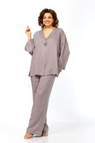 Комплект брючный свободного кроя состоит из кардигана и брюк. Брюки свободного кроя прямые с карманами в боковых швах и поясом на резинке. Кардиган с центральной застежкой на 2 потайные кнопки. Перед с V-образной горловиной, украшен брошью. Рукав втачной одношовный со спущенной линией плеча. По боковым  швам разрезы. По бортам широкая отделочная полочка. Фурнитура может отличаться от заявленной на фото.