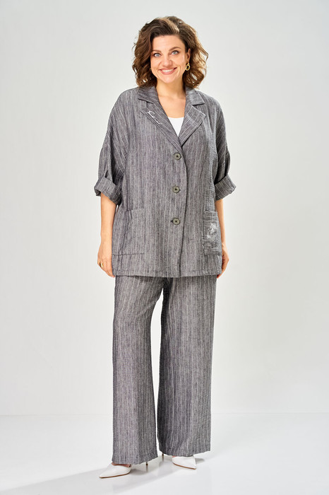 Комплект женский состоит из брюк и жакета. Брюки прямые, свободного кроя с карманам в  боковых швах и поясом на резинке. Жакет прямого кроя с центральной застежкой на 3 петли и пуговицы. Перед с боковыми накладными карманами, левый карман украшен печатью. Воротник отложной с лацканами, правый лацкан украшен печатью. Рукав втачной со спущенной линией плеча. В боковых швах обработаны разрезы. Длина по спинке 72-74 см, длина рукава 29-30 см. Длина брюк 107-108 см.