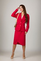 Жакет полуприлегающего силуэта, длинной чуть ниже линии бедер. Спинка с вертикальными рельефами. Перед с рельефами от проймы и отрезным бочком. С нагрудными вытачками от рельефов. В шве рельефа обработаны карманы в швах. Жакет с фигурным вырезом горловины, фигурным бортом, застегивающимся на одну пуговицу. Рукава втачные двух-шовные.