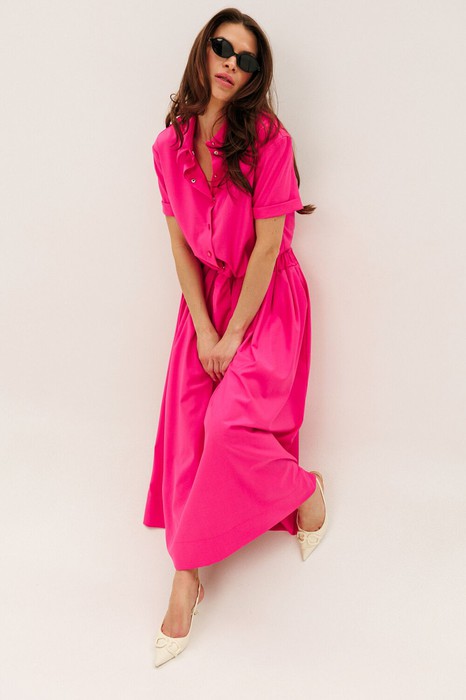 Костюм женский из однотонной ткани платьево-блузочного ассортимента. Блузка прямого силуэта сзастежкой на пробивные кнопки, и сформированными завязками по низу. Вортник с притачной стойкой. Рукав втачной с цельнокроенными отложными манжетами. Юбка широкая прямая с притачным поясом с эластичной тесьмой внутри. По верхнему срезу юбки заложены складки. В боковых швах обработаны карманы.