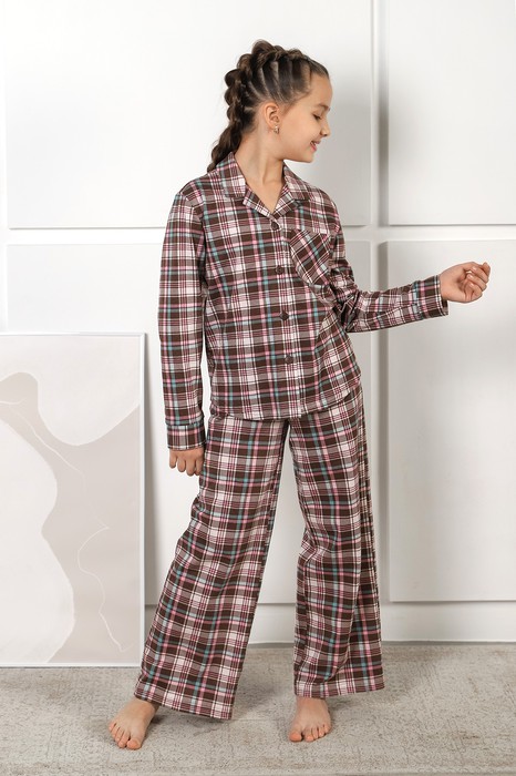 Костюм из хлопкового полотна кулирного переплетения с набивным рисунком эксклюзивного дизайна, домаший для девочки. Джемпер с отложным воротником, застёжкой на петли и пуговицы, со слегка спущенной линией плеч, с нагрудным накладным карманом. Брюки расширенные к низу, с боковыми карманами, на притачном поясе с отстроченной эластичной тесьмой.