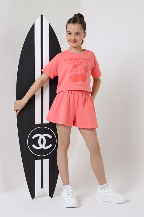 Эффектный костюм для девочки из хлопкового полотна с лайкрой. Футболка с принтом в модной стилистике, свободная, со спущенной линией плеч, округлым вырезом горловины, короткими рукавами. Шорты-юбка с боковыми карманами, на притачном поясе с отстроченной эластичной тесьмой.