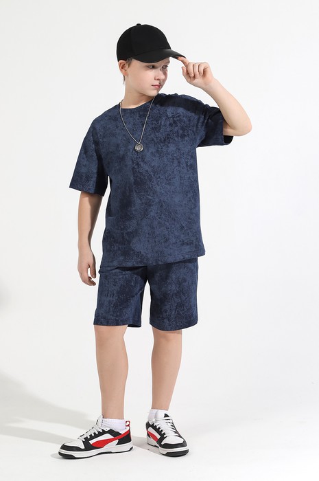 Костюм для мальчика, состоящий из футболки и шорт. Футболка - свободного покроя, короткими втачными рукавами и горловиной овальной формы, обработанной втачной планкой. По шву втачивания планки настрочена двойная отделочная строчка. Шорты - удлиненные, с карманами в боковых швах, на притачном поясе с эластичной тесьмой внутри.