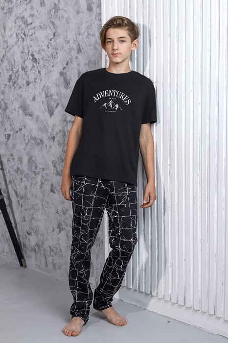 Костюм для мальчика, из хлопчатобумажных трикотажных полотен кулирного переплетения. Однотонная футболка со слегка спущенной линией плеч, округлым вырезом горловины, с принтом. Брюки из полотна с набивным рисунком эксклюзивного дизайна, прямые, на притачном поясе с отстроченной эластичной тесьмой, с боковыми карманами.