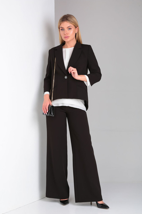 Элегантный брючный костюм в комплекте с шифоновой блузкой.Жакет полуприлегающего силуэта с воротником и лацканами классической формы, застежкой на 1 пуговицу. Особое внимание заслуживает экстравагантная спинка с имитацией запаха и серебристыми металлическими акцентами в виде  цепочек, соединяющих две половинки отлетной спинки.Брюки прямого покроя расширены от линии бедра. Комфортная посадка брюк и подчеркивающий фигуру крой сделает их любимым предметом вашего гардероба.Костюм выполнен из материала модных цветов, не требующего особого ухода, пластичен и удобен в носке.Блузка-туника нежного молочного пастельного оттенка с шифоновыми рукавами. Блуза очаровывает своим красивым непринужденным полуприлегающим силуэтом, фигурной линией низа, и конечно же спинкой.Фантазийная спинка с шифоновыми вставками и воланами, красиво драпирующимися и являющимися одним из популярных трендов, шикарно смотрится как самостоятельно, так и в сочетании с эффектным разрезом на жакете.