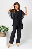 Элегантный брючный костюм в комплекте с шифоновой блузкой.Жакет полуприлегающего силуэта с воротником и лацканами классической формы, застежкой на 1 пуговицу. Особое внимание заслуживает экстравагантная спинка с имитацией запаха и серебристыми металлическими акцентами в виде  цепочек, соединяющих две половинки отлетной спинки.Брюки прямого покроя расширены от линии бедра. Комфортная посадка брюк и подчеркивающий фигуру крой сделает их любимым предметом вашего гардероба.Костюм выполнен из материала модных цветов, не требующего особого ухода, пластичен и удобен в носке.Блузка-туника нежного молочного пастельного оттенка с шифоновыми рукавами. Блуза очаровывает своим красивым непринужденным полуприлегающим силуэтом, фигурной линией низа, и конечно же спинкой.Фантазийная спинка с шифоновыми вставками и воланами, красиво драпирующимися и являющимися одним из популярных трендов, шикарно смотрится как самостоятельно, так и в сочетании с эффектным разрезом на жакете.