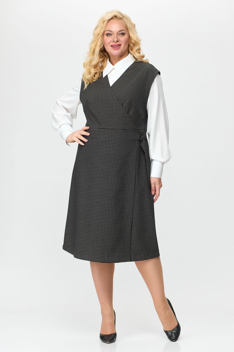 Идеальный офисный комплект состоит из сарафана и блузки. Сарафан полуприлегающего силуэта, отрезной по линии талии, на запах с поясом. Полочка с нагрудными вытачками. Спинка со средним швом. Обтачка по спинке (обработка горловины), глубокая. Блуза прямого силуэта, нежная и струящаяся, ткань стойкая к сминанию. По центру полочки застежка в виде планки на 7 петель, 7 пуговиц. Воротник стояче-отложной, рукав втачной, внизу обработан притачной манжетой. В боковых швах небольшие разрезы.