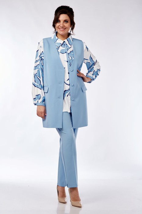 Комплект подчеркивает элегантность, подарит комфорт и уверенность, сделает образ незабываемым. Комплект состоит из блузки, жилета и брюк. Жилет без воротника с треугольным вырезом, что визуально удлиняет силуэт, делая его более стройным, с центральной бортовой застежкой. Блузка свободного кроя, является отличным дополнением для модного лука. Интересным элементом является по центру полочки планка с застежкой на петли и пуговицы. Воротник классический, рубашечный на отрезной стойке. Рукав втачной, по низу оформлен складками и притачной манжетой. Спинка с отрезной кокеткой, и встречной складкой, для повышенной комфортности. Низ изделия асимметричный в боковых швах разрезы. Брюки слегка зауженные к низу. Пояс притачной, частично на резинке. Застежка спереди на тесьму-молнию, петлю-пуговицу