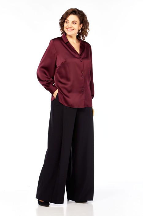 Комплект женский брючный 2-х предметный. Прекрасный вариант для визитов в офис, а так же в место, где уместен деловой стиль. Модель полуприлегающего силуэта с застежкой спереди на пуговицы. Воротник аккуратный отложной. Рукав втачной, по низу оформлен складками и притачной манжетой, застегивающейся на пуговицы. В боковых швах скругленные разрезы. Спинка с вертикальными выточками. Невероятно комфортные, элегантные брюки-палаццо,  образ в котором будет привлекать к себе внимание окружающих. Идеально подходит как для офиса, так и для вечернего выхода. Брюки свободные. По переду заложены складки, в боковых швах расположены боковые карманы, застежка-молния. Пояс притачной, сзади на резинке, это обеспечивает комфортную посадку. Широкий крой палаццо добавляет образу легкость и непринужденность, стрелки визуально удлиняют силуэт.