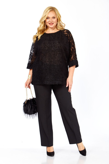 Комплект женский брючный 2-х предметный. Праздничная элегантная блузка полуприлегающего силуэта, выглядит эффектно, прекрасно подойдет для вечерних мероприятий. Горловина аккуратной округлой формы. Рукав выполнен из мягкого кружева, что придает дополнительный шарм, длина 7/8. В боковых швах предусмотрены разрезы. Брюки с заутюженными стрелками слегка зауженные к низу. Пояс притачной, частично на резинке.