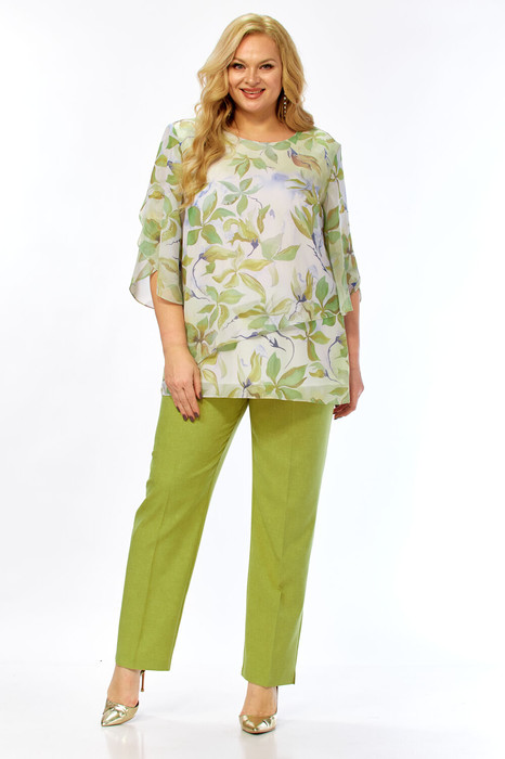 Стильный образ подчеркнет привлекательность. Комплект, который с легкостью обратит на себя внимание. Изделие позволит чувствовать себя ярко и уверенно. Воздушная невесомая блуза, для тех, кто ценит легкость и воздушность, выполнена из шифона, с отлетной деталью, что создает приятное ощущение свободы в движении. На полочке нагрудные вытачки, вырез горловины аккуратной округлой формы. Рукав втачной, свободный. Блуза на подкладке. Брюки классические с заутюженными стрелками, слегка зауженные к низу, оформлены притачным поясом, частично на резинке. Застежка спереди брюк на молнию и петлю-пуговицу.