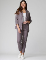 Комплект женский состоящий из бомбера и юбки. Бомбер прямого силуэта со спущенной линией плеча, на притачной манжете. Воротник-стойка, перед с центральной бортовой застежкой на кнопки и боковыми карманами ввиде листочки с втачными концами. Низ бомбера выполнен ввиде кулисы. Спинка с декоративным настрочным элементом. Юбка прямого силуэта с притачным поясом на резинке и разрезами в боковых швах. Перед со средним швом. Перед и спинка с накладными фигурными карманами. Бомбер и юбка с отделочными элементами ввиде тесьмы из основной ткани, пристегивающиеся на кнопку. Край борта, воротник, средний шов и карманы юбки выполнены с открытым срезом.