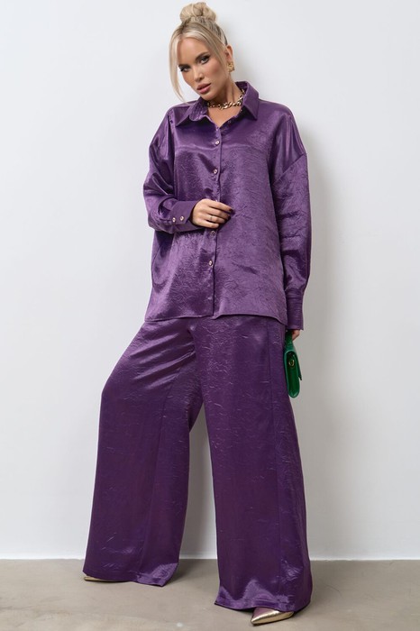 Рубашка свободного кроя и широкие брюки создают ощущение лёгкости и комфорта, при этом силуэт остаётся элегантным.