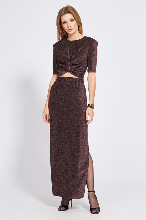 Комплект: блузка + юбка. Комплект выполнен из трикотажного полотна с люрексом. Блузка приталенного силуэта длиной до линии талии. Спереди средний шов с застежкой на потайную молнию, перекрут со сборками по боковыми швам. Спинка цельная. Рукав втачной одношовный, длиной до линии локтя. Блузка с плечевыми накладками, на подкладке. Юбка длиной макси, зауженная к низу. Переднее и заднее полотнища цельные. В левом боковом шве разрез. Юбка на цельнокроеном поясе. Юбка без подкладки.
