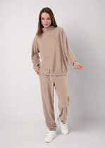 Костюм свободного прилегания выполнен из мягкой немнущейся ткани. Блузон с капюшоном и цельнокроеным рукавом по низу которого кулиса с завязками. По полочки блузона выполнен карманы "рамки", низ блузона затягивается на кулису. Брюки- шаровары на притачном поясе с резинкой, по боковым брюк карманы. низ брюк на кулисе. Декорированы брюки густой дизайнерской вышивкой "кошка" Длина брюк 100 см. длина блузона-62 см.