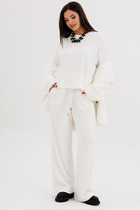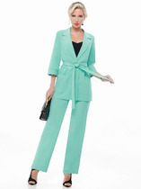Костюм женский выполнен из льна-вишера. Костюм состоит из брюк и блузона. Брюки зауженные к низу на притачном поясе с резинкой. В боковых швах имеются функциональные карманы. Блузон из ткани в полоску с асимметричной молнией по переду. Горловина - асимметричная. Рукав – приспущенный с манжетам по низу. Спинка с кокеткой и складкой. Низ – асимметричный