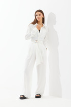 Костюм женский выполнен из хлопковой ткани, состоит из блузы и брюк. Блуза ассиметричного кроя, с полами разной длины. Горловина воротник-стойка. Рукав - кимоно с широкой подгибкой по низу. по переду изделия расположена планка с застежкой (петля-пуговица)- и нанесен принт, спинка изделия разрезная с застежкой петля-пуговица. Брюки на притачном поясе с резинкой, в боковых швах по низу изделия расположена функциональная кулиса позволяющая регулировать (присборивать)длину брюк по боковому шву.