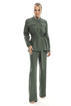 Костюм женский 3х предметный состоит тз брюк блузы и жилета,  блуза выполнена из хлопковой ткани, полуприлегающего кроя , горловина воротник на стойке, рукав втачной с высокой манжетой по низу рукава, застежка - планка с петлей пуговицей, низ фигурный. Жилет свободного кроя, укороченный, воротник отложной с лацканами, по переду жилета съёмный пояс, с застежкой петли -пуговицы. Брюки средней посадки, прямого кроя на притачном поясе с резинкой, в боковых швах имеются карманы, застежка петля- пуговица и молния на гульфике.
