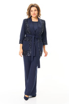 Комплект брючный состоит из джемпера и брюк. Брюки средней посадки расширенные к низу ( клеш от бедра , Юбка- брюки )выполнены из атласной ткани с приглушенным блеском. Брюки на притачном поясе с резинкой и застежкой молнией. Блузон выполнен из ткани с бахромой, горловина округлая - - лодочка, рукав втачной длинный, на спинке глубокий округлый вырез и декоративная жемчужная нить.